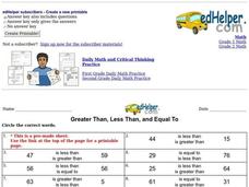 In this comparing numbers learning exercise, students examine 20 pairs of 1 and 2 digit numbers. Students identify whether the first number in each pair is greater than, less than, or equal to the second number.