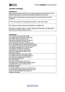 In this literature worksheet, students use Hamlet's soliloquy for a series of activities. Students match quotes with modern interpretations. Students reflect on and relate to Hamlet's feelings. They also give advice to Hamlet.