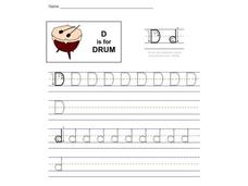 In this handwriting worksheet, students practice writing the upper and lower case letter D. They trace a row of each letter and write a row on their own.
