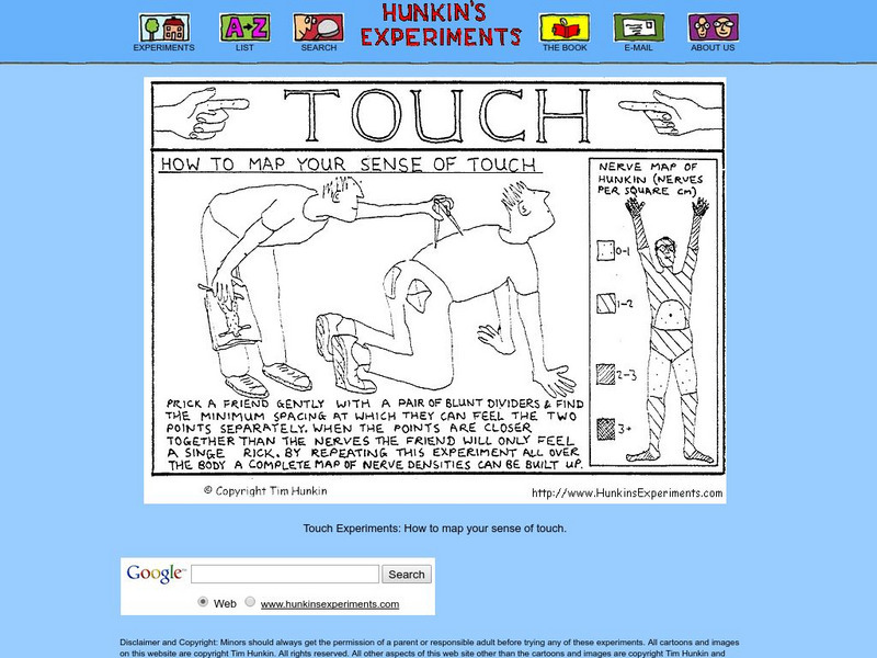 Hunkin's Experiments is a group of simple cartoon illustrations of scientific principles. Some would work well in the classroom, but others have little value beyond entertaining students. All of the projects are easy to do. This would be a good demonstration to use with students at the beginning of any unit on touch or the senses.