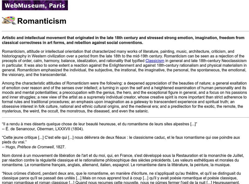 This short article tells of the period of time in the late 18th century, when strong emotion and irrational behavior was expressed through the arts. It tells how Romanticism rejected harmony, balance and calmness, and yet typified emotion. Includes translation in French