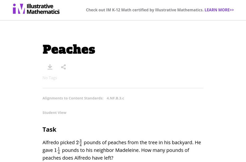 This task provides a context where it is appropriate for students to subtract fractions with a common denominator; it could be used for either assessment or instructional purposes. Aligns with 4.NF.B.3.c.