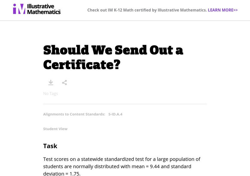 Should Fred receive a certificate for scoring in the top 2.5% of a statewide standardized test? Given the test scores for a large population and the mean and standard deviation, students will decide if Fred's score is good enough. Students will communicate their finding in a narrative/report form in context - not just simply as a computed number. Explanations are provided.