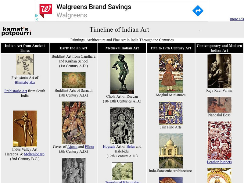 A timeline tracing the development of Indian art from ancient times to the present. Includes beautiful clickable images with extensive descriptions.