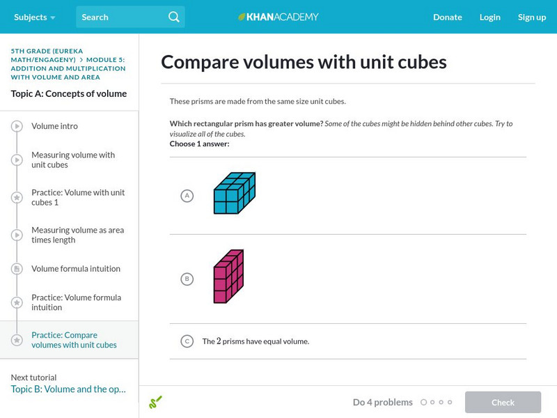 In this exercise, students practice comparing volumes with unit cubes. Students receive immediate feedback and have the opportunity to get hints and try questions repeatedly.