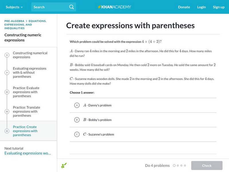 Practice creating expressions with parentheses from real-world contexts. Students receive immediate feedback and have the opportunity to try questions repeatedly, watch a video or receive hints.