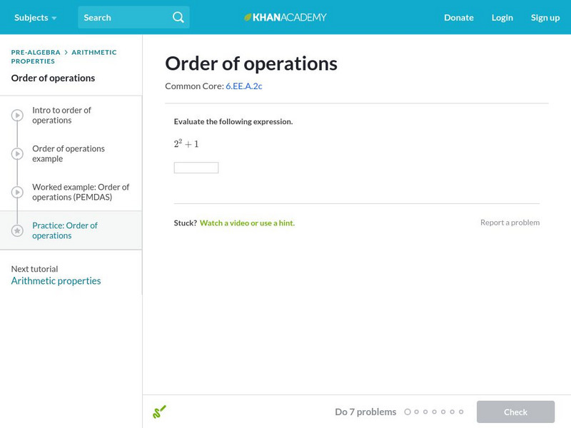 Practice evaluating expressions using the order of operations. Students receive immediate feedback and have the opportunity to try questions repeatedly, watch a video or receive hints.
