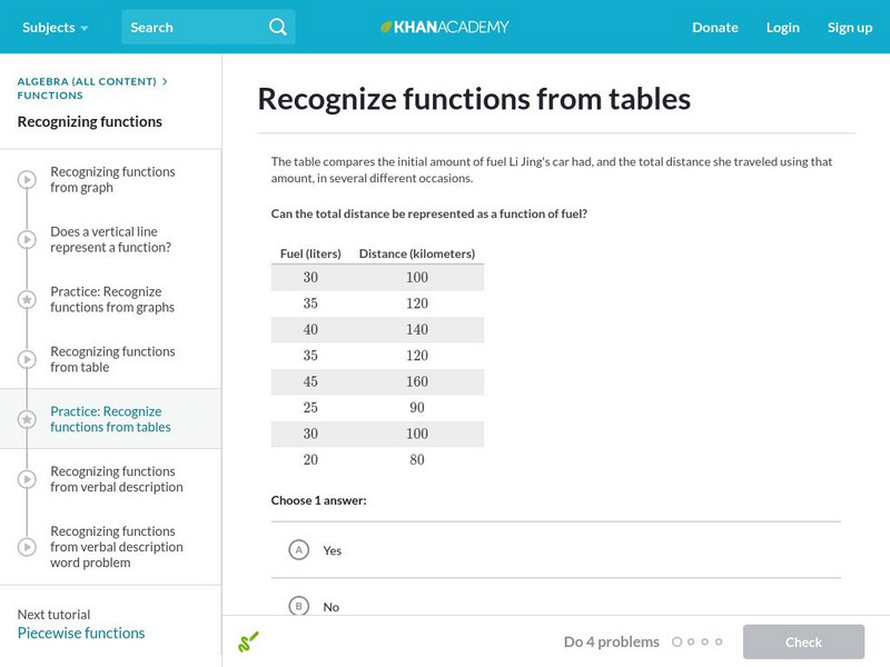 In this exercise, students practice recognizing functions from tables. Students receive immediate feedback and have the opportunity to watch a video, get hints, or try questions repeatedly.