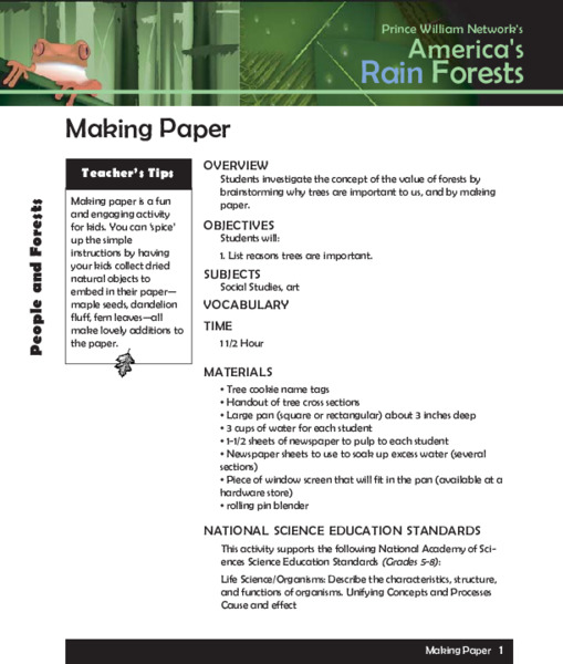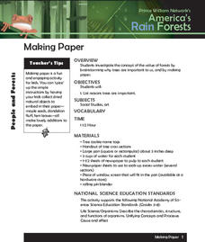 Students brainstorm why trees are important to humans and the value of forests. They then participate in making paper in class. They may decorate the paper adding glitter, dried flowers, etc.