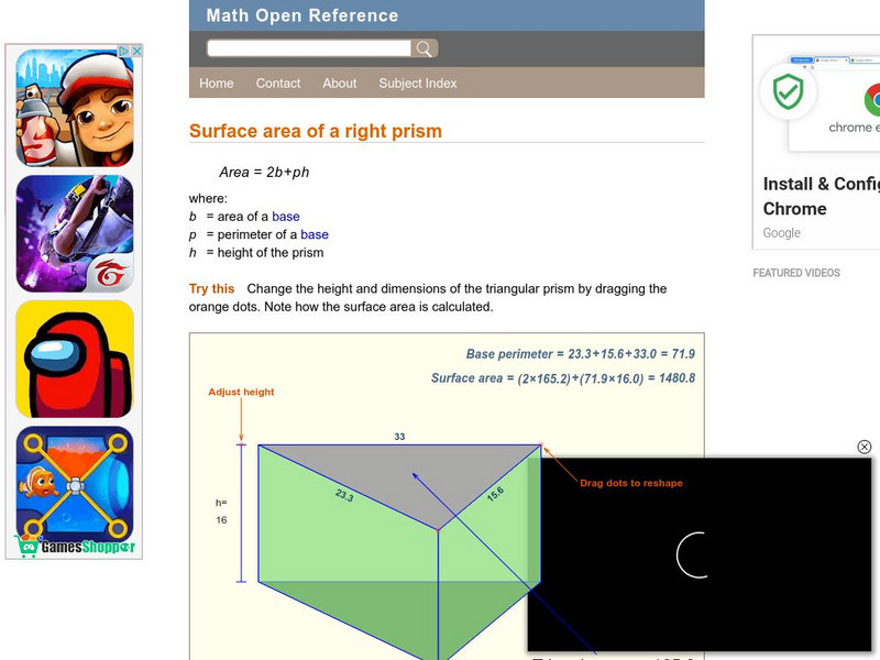 Use this interactive tool to find the surface area of a right prism. Try different figures for the height and the dimensions of the prism to see how these affect the surface area. Properties of right prisms are explained, how to use a formula to calculate the area, and what regular and oblique prisms are.