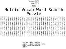 In this word search worksheet, students locate words related to the metric system. The word list includes gram, length, scale, weight, and gravity.