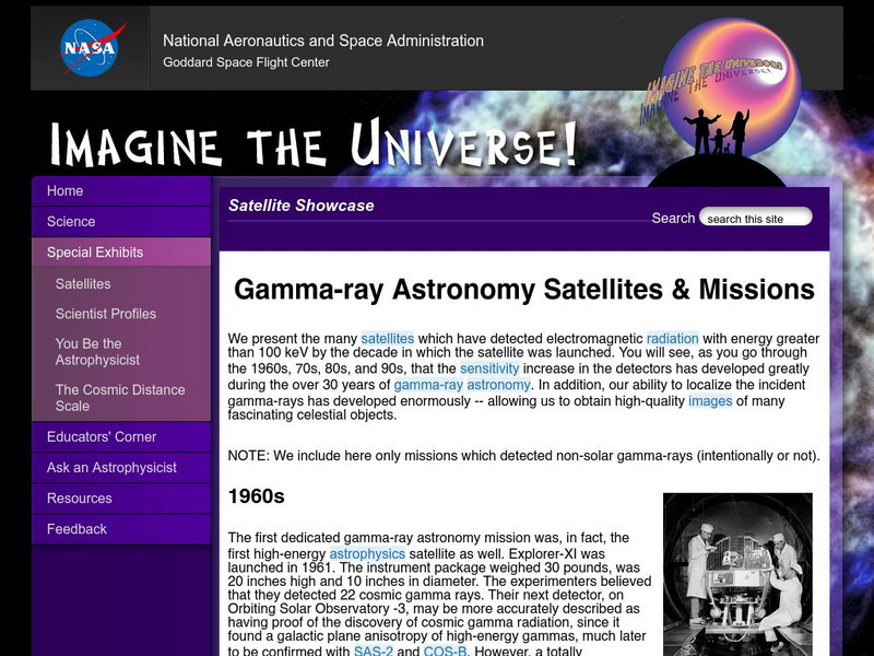 "We present the many satellites which have detected electromagnetic radiation through the 1960s, 70s, 80s, and 90s." Visit this site to read more about the development of satellites throughout the history of gamma-ray astronomy. Graphics and links to individual satellites included.