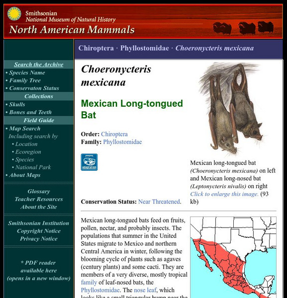 Mexican long-tongued bats feed on fruits, pollen, nectar, and probably insects. The populations that summer in the United States migrate to Mexico and northern Central America in winter, following the blooming cycle of plants such as agaves (century plants) and some cacti. Learn more about the Choeronycteris mexicana, more commonly known as a Mexican Long-tongued Bat, in this easy-to-read species overview by the Smithsonian's National Museum of Natural History.