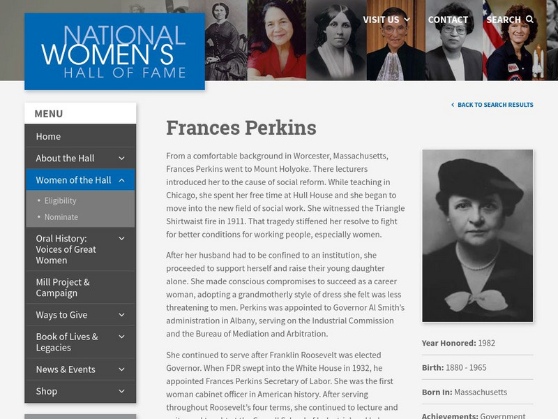 The National Women's Hall of Fame presents a brief overview of the life of Frances Perkins, who was, among many other accomplishments, the first woman Cabinet officer in American history.