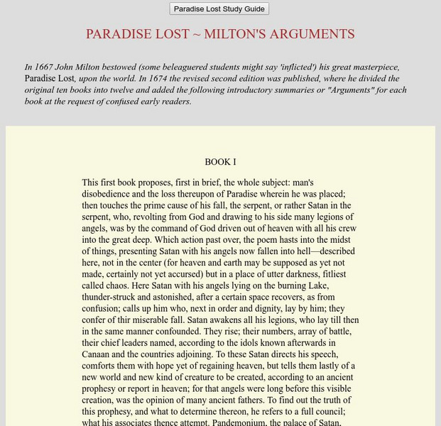 Taken from Milton's second publication of his epic poem. These short summaries were included to help illuminate the meaning of the original text. Site by New Arts Library.