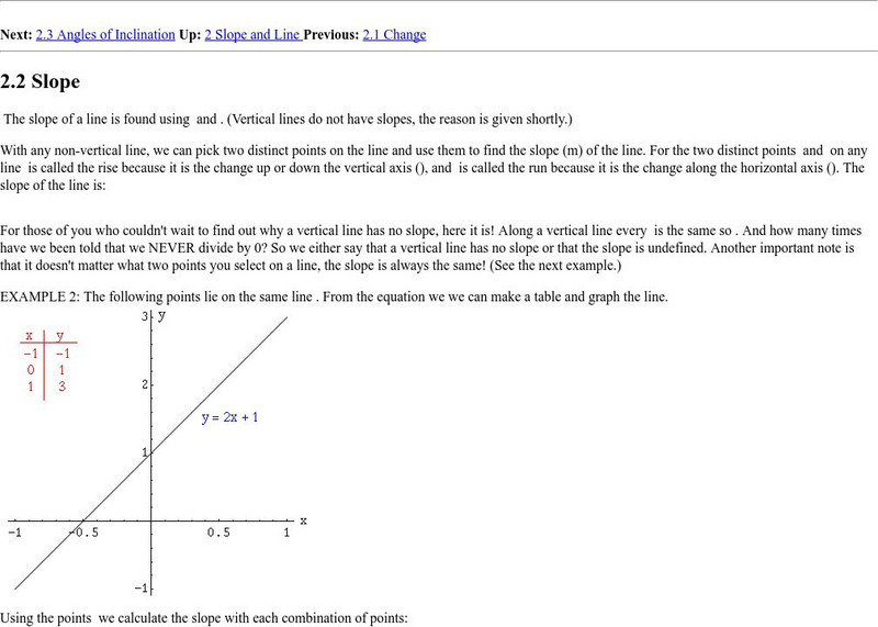 This Northeast Parallel Architecture Program, Syracuse University site explains and illustrates by using the changes in the values of x and y you can determine the slope of a line.
