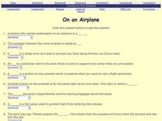 In this ESL worksheet, students focus on various aspects associated with an airplane. Students complete 16 fill in the blank sentences using the drop down menu to self check each question.
