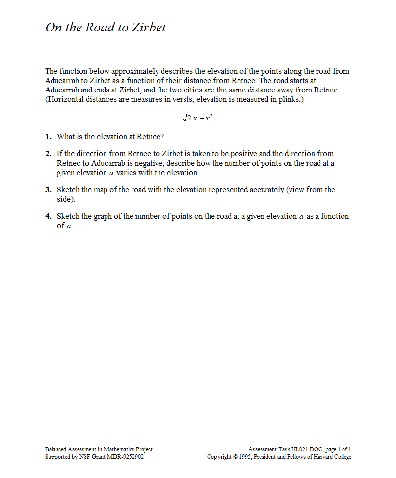 The road to a greater knowledge of functions lies in the informative resource. Young mathematicians first graph a square root function in a short performance task. They then use given descriptions of towns and the key features of the graph to identify the locations and elevations of the towns.