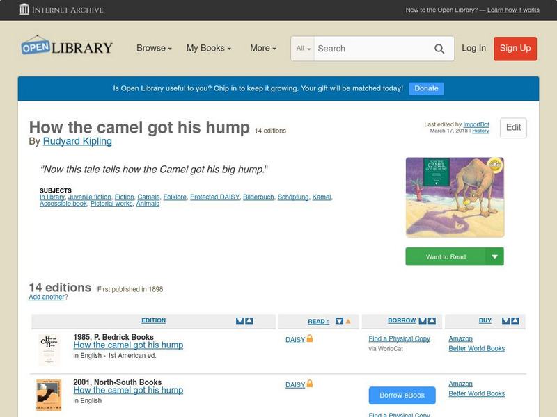 This ebook version of Rudyard Kipling's How The Camel Got His Hump has been made available in multiple formats by the Open Library. Editions of the full novel, organized by year of publication, may be accessed here.