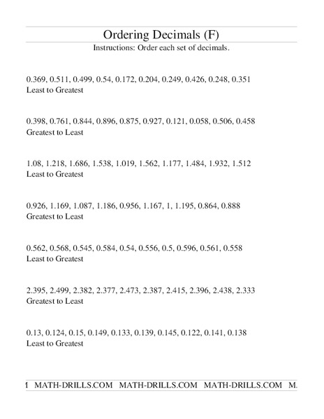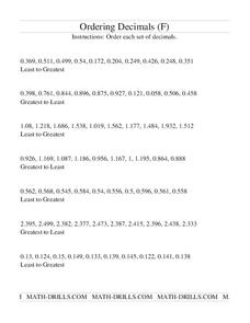 In this decimals worksheet, students order 7 sets of decimals from least to greatest and vice versa. A website reference for additional resources and an answer key are provided.