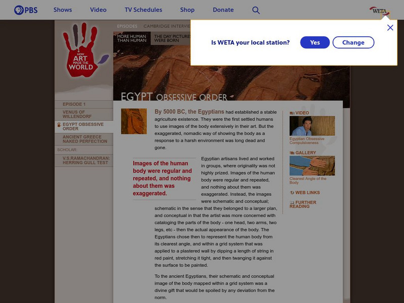 PBS documentary considers how ancient Egyptian artists chose to represent the human body and answers questions about how the cultural values of a society, such as the desire for order, shape its art. With close-ups of Egyptian art that describe and illustrate characteristic poses and a video clip that explains the grid system that Egyptians used to draw figures.