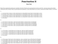 For this punctuation worksheet, students read the sentences in each set and determine if there are punctuation errors. Students select the with the correct punctuation to complete the 10 online exercises.