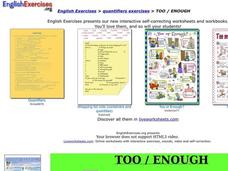 In this ESL activity, students focus on different English quantifiers. Students complete 15 fill in the blank exercises using either "too" or "enough" to complete each statement and then clicking on the interactive website key when finished.