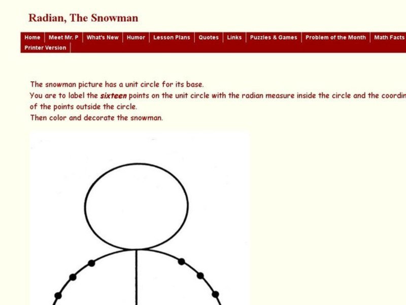 For this snowman worksheet, students label points on a circle with radian measures. They identify the coordinates of the points outside the circle. Students decorate the snowman. This one-page worksheet contain 1 problm. The answer is provided.