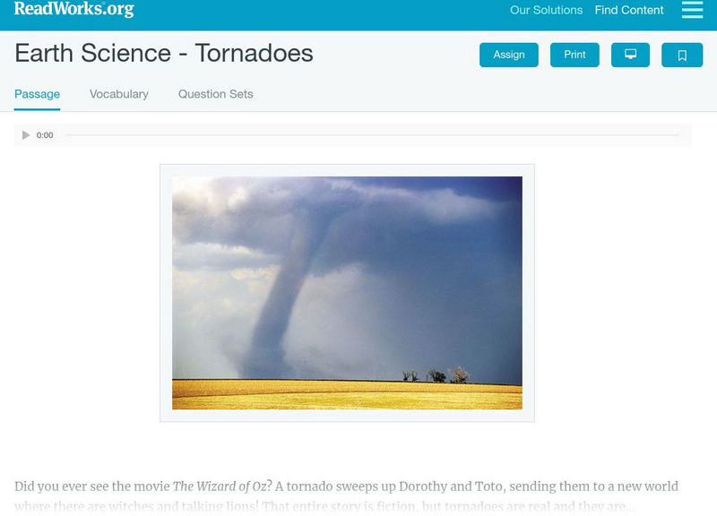 [Free Registration/Login Required] An informational text about tornadoes. A question sheet is available to help students build skills in reading comprehension.