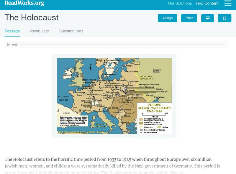 [Free Registration/Login Required] This informational text passage shares basic facts about the Holocaust. This passage is a stand-alone curricular piece that reinforces essential reading skills and strategies and establishes scaffolding for vocabulary learning. It contains questions and teacher guides and can be used as both a read-aloud exercise and an individual practice tool.