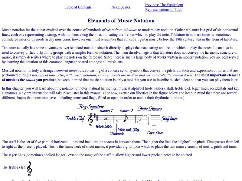 Fine site that focuses on music notation and on learning how to read it with a focus on the guitar. Includes charts, tips, and other useful information.