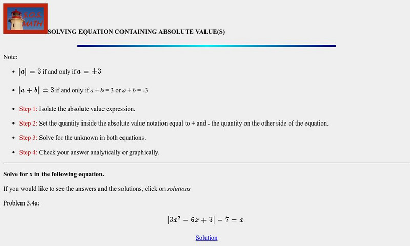 This lesson from S.O.S. Mathematics gives the definition of absolute value and examples on how to solve absolute value equations. Includes problems and solutions.