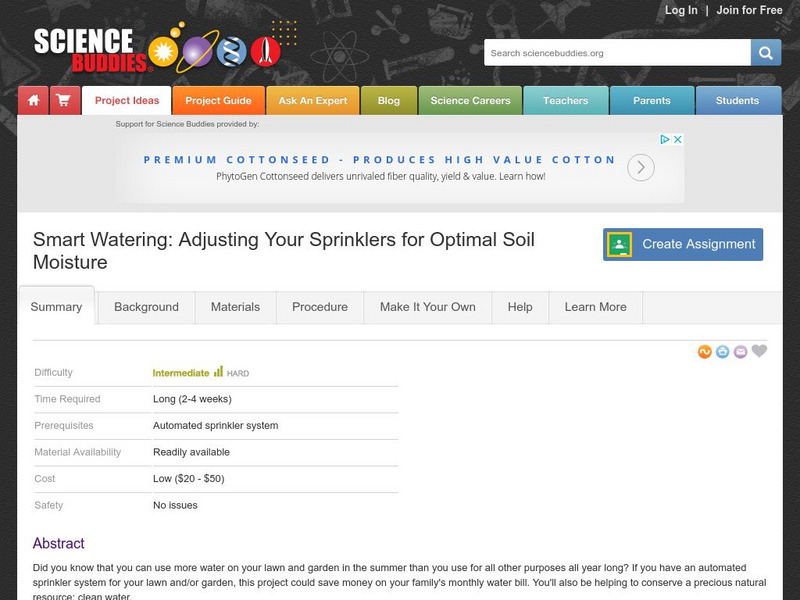 Use this science fair project to learn how to test your soil to see if it is getting the right amount of water from the sprinklers. Project is set up beginning with an abstract, objective, and introduction, followed by a section on terms, concepts, and questions, bibliography, list of materials and equipment, experimental procedure, suggestions on how to vary the experiment, plus a focus on the sort of careers this experiment might relate to.