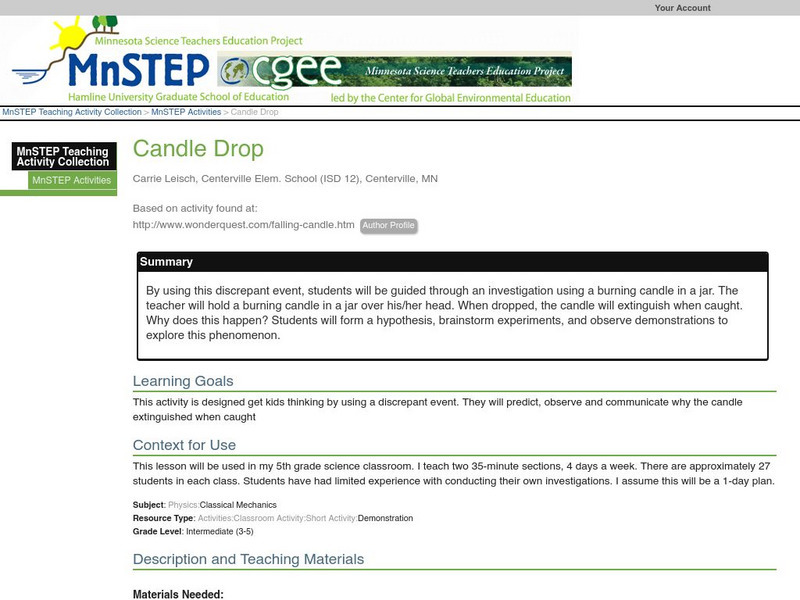 By using this discrepant event, students will be guided through an investigation using a burning candle in a jar. The teacher will hold a burning candle in a jar over his/her head. When dropped, the candle will extinguish when caught. Why does this happen? Students will form a hypothesis, brainstorm experiments, and observe demonstrations to explore this phenomenon.