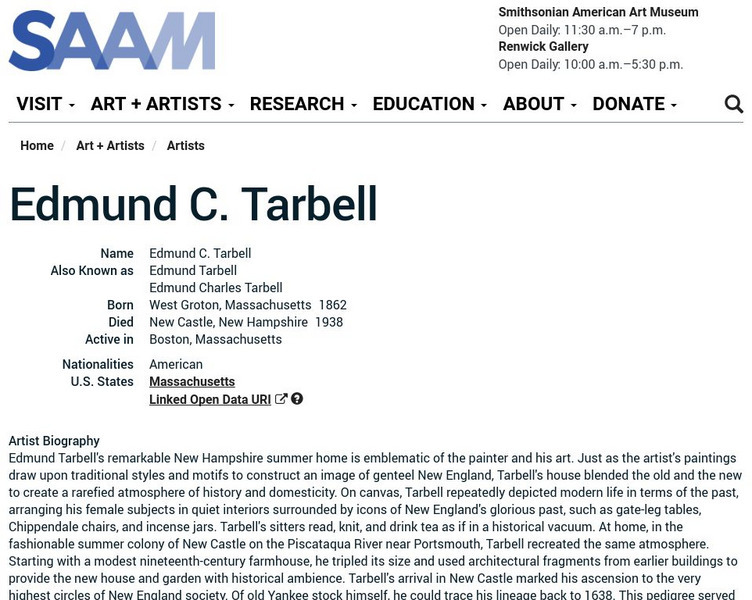 As part of the Smithsonian Art Museum's database of artists, this site provides biographical information on Edmund C. Tarbell in addition to an extensive listing of his works as displayed at the museum.