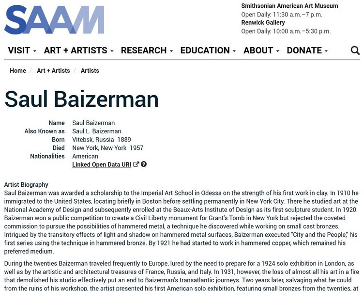 As part of the Smithsonian Art Museum's database of artists, this site provides biographical information on Saul Baizerman. Baizerman worked as a sculpture artist specifically with clay and bronze.