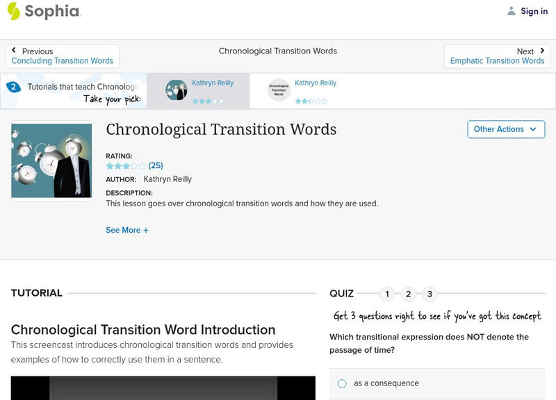 This screencast focuses on chronological, or time-ordered, transition words. It explains the need and uses for these transitions, provides a short list of transition words, and examples of how to use them in different types of writing. [2:26]