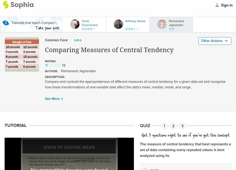 Compare and contrast the appropriateness of different measures of central tendency for a given data set and recognize how linear transformations of one-variable data affect the data's mean, median, mode, and range. This lesson is 1 of 3 in the series titled "Comparing Measures of Central Tendency." There is a short video tutorial in addition to mastery questions.