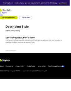 This tutorial focuses on describing an author's style. It explains the five main elements constituting style: syntax, diction, punctuation, sensory details, and literary/rhetorical devices. It lists nine common writing styles and gives an example from literature showing how to determine an author's style. [5:12]