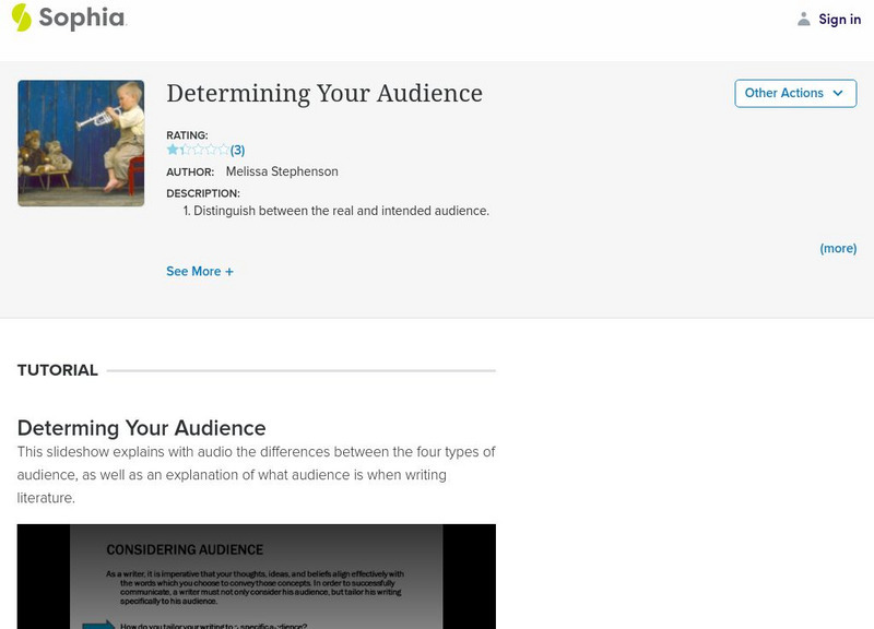 A series of four screencasts explaining the importance of audience. Students learn the difference between the real audience and the audience the writer intends, how to create a specific audience instead of a general audience, how the audience affects the writer's style and word choice, and how to incorporate the intended audience into the title of the piece. W.9-10.4 Write/Aud/purp, W.9-11.12 Write Routinely