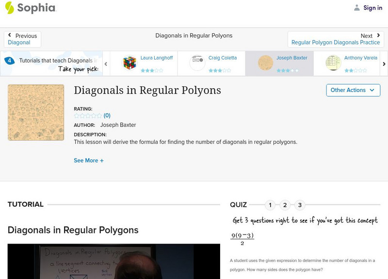 In this video tutorial, the instructor demonstrates how to determine the number of diagonals in a regular polygon by looking at the number of vertices, and the number of diagonals. Use the formula to complete the assessment to check understanding. [7:56]