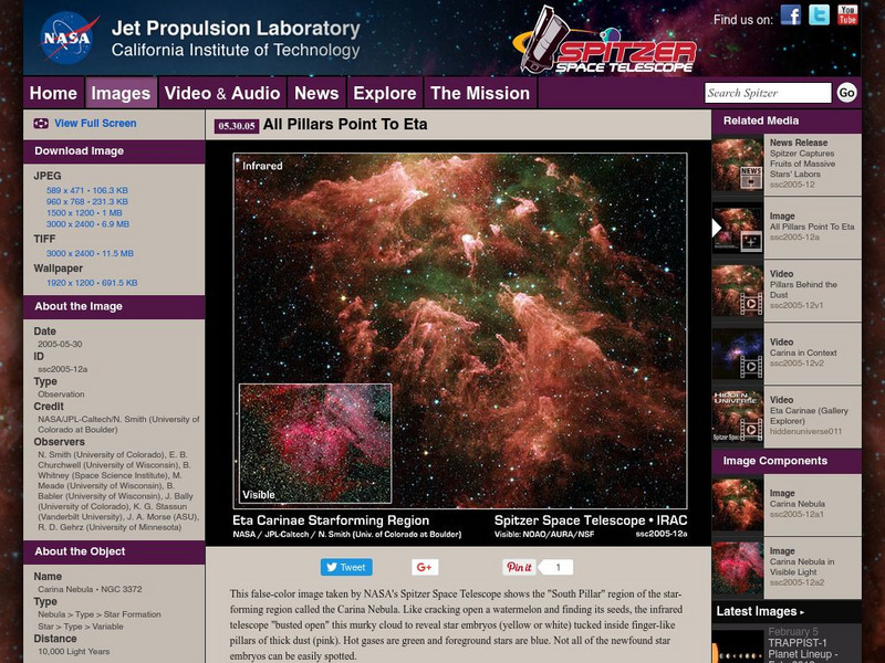 This image, titled "All Pillars Point to Eta" features Eta Carinae, which is part of the Carina Nebula and is over 100 times more massive than the sun. The text under the image details various specifics about the picture.