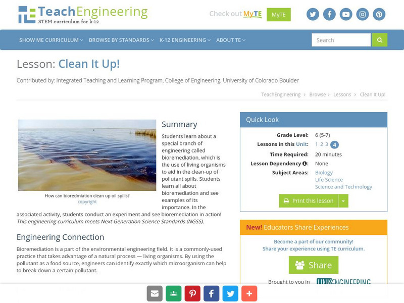 Students learn about a special branch of engineering called bioremediation, which is the use of living organisms to aid in the clean-up of pollutant spills. Students learn all about bioremediation and see examples of its importance. In the associated activity, students conduct an experiment and see bioremediation in action!