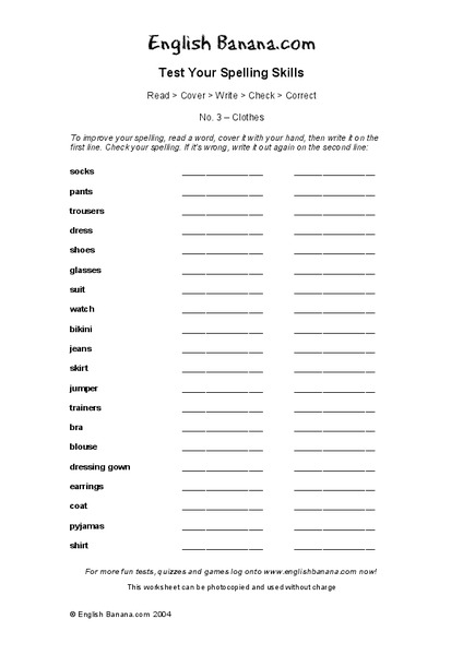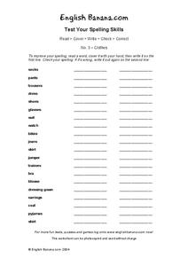 In this spelling learning exercise, 4th graders practice spelling twenty clothing words. Students are encouraged to read each word, cover it, write it, check it and correct their spelling if necessary.