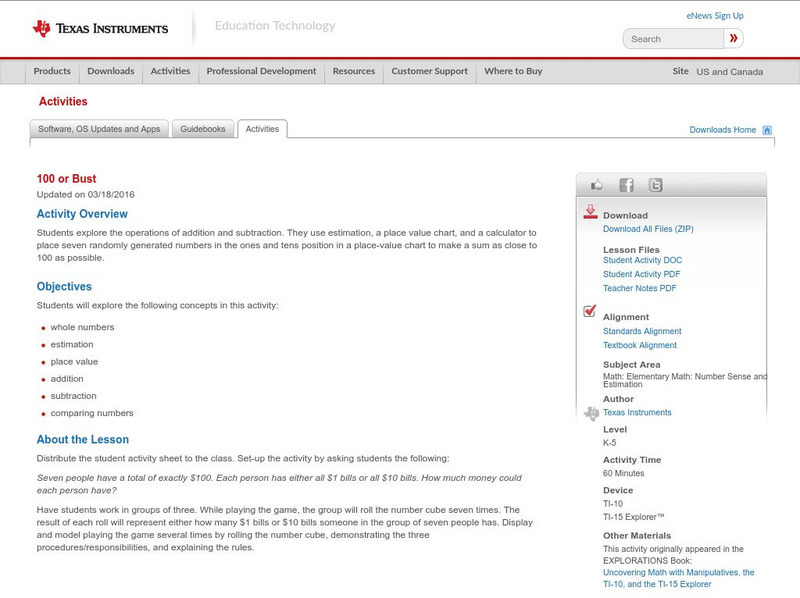 In this activity, students explore the operations of addition and subtraction. They use estimation, a place value chart, and a calculator to place seven randomly generated numbers in the ones and tens position in a place-value chart to make a sum as close to 100 as possible.
