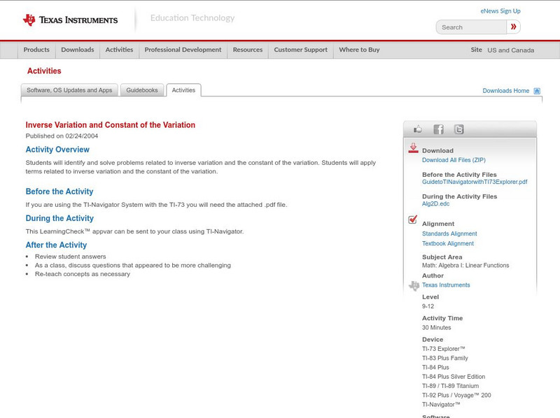 Students will identify and solve problems related to inverse variation and the constant of the cf the variation. Students will apply terms related to inverse variation and the constant of the variation.