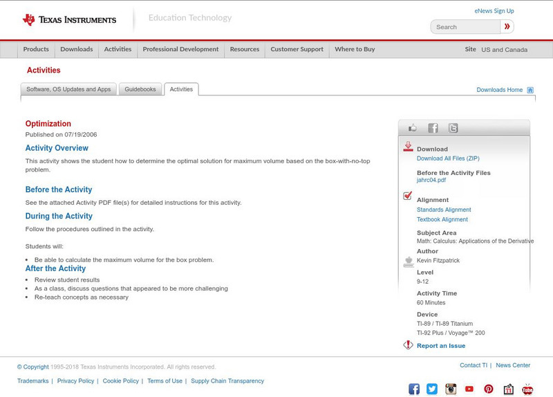 This activity shows the student how to determine the optimal solution for maximum volume based on the box-with-no-top problem.