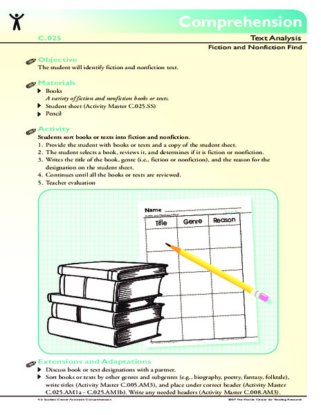 Scholars analyze fiction and nonfiction text and fill in a worksheet detailing the text's title, genre, and reason for its classification.