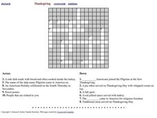 In this Thanksgiving worksheet, students complete a crossword puzzle filling in ten clues related to the traditions of Thanksgiving and the history of Thanksgiving.