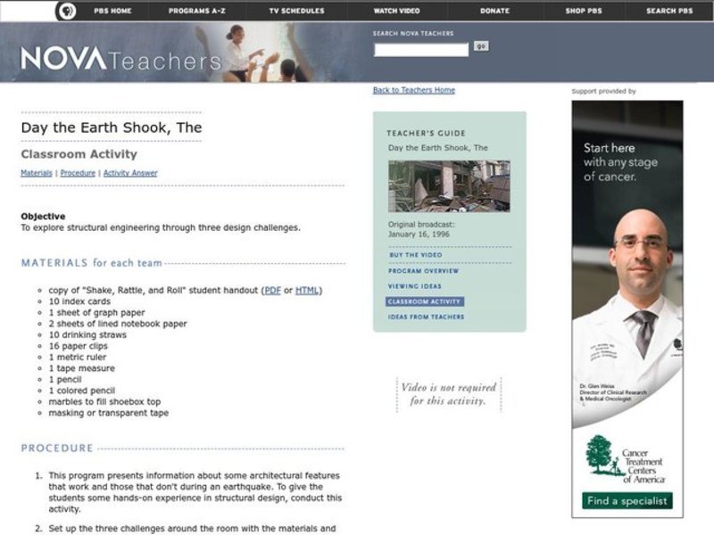 Students explore structural engineering through three design challenges. They examine information about some architectural features that work and those that don't during an earthquake. Students build and test their structure and record the results.